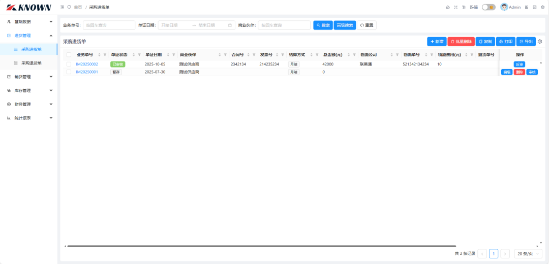 进货管理:包含采购进货单、采购退货单。